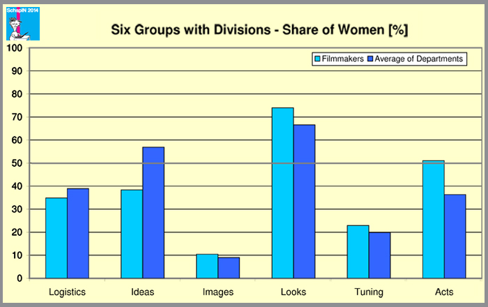 And this is the group with the highest proportion of female filmmakers. All 7 positions considered the average is 66,6 %, and the female ratio of all individuals in this group is even higher, 74 %, nearly 3/4. Looking at costume and make-up we find even higher figures, both have more than 90 % women, which of course means that less than 10 % men work in these departments. The other day a female make up artist told me that in the 1950s the majority of make up artists in Germany were male. Why has this changed? Both boys and girls enjoy dressing up and disguising themselves for carneval parties etc., and they still do when they are 18 and have their “Abimottowochen”. (this is something that happens at a lot of schools, at least in the north of Germany: in the last term at school, before or after the final exams there is a week where every day has a different motto according to which the pupils come to school dressed up, disguised, in costume. Abi is short for Abitur, which are the final exams, similar to but different from A-levels)