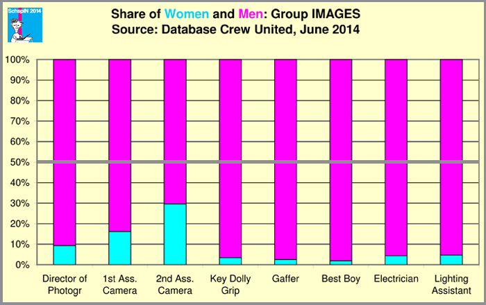 Der Anteil der Kamerafrauen beträgt nur 10 %, allerdings sind die Werte für die Erste und Zweite Kameraassistenz höher (16,2 bzw. 29,6 %). Was bedeutet das? Wächst da der weibliche Nachwuchs heran (vorausgesetzt, dass die Kameralaufbahn über die Assistenzpositionen geht)? Auch hier könnten natürlich die Angaben der Filmschulen aufschlussreich sein.