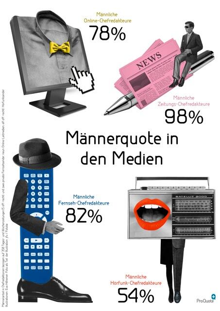 Der Verein ProQuote hat gerade neue Zahlen zur Männerquote in den Medien veröffentlicht: 98% Chefredakteure im Printbereich, 82% TV-Chefs, 78% Online-Chefredakteure, 54% Hörfunkchefredakteure.