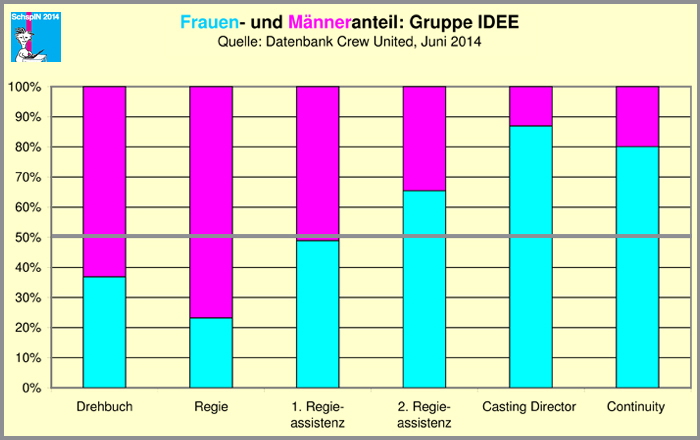 Die Positionen Casting (laut Casterin Anja Dihrberg eine „dienende Tätigkeit“) und Continuity weisen Frauenanteile zwischen 80 und 90 % auf. Bei einem derartigen Übergewicht eines Geschlechts stellt sich die Frage, warum diese Tätigkeiten für das andere Geschlecht so unattraktiv sind.