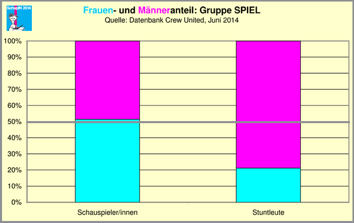 Insgesamt sind 9.437 weibliche und 12.729 männliche Filmschaffende in allen 34 Positionen erfasst. Die Schauspielerinnen und Stuntfrauen (Gruppe SPIEL) stellen 54,4 % aller weiblichen Filmschaffenden, Schauspielerin ist also der vorherrschende FIlmberuf für Frauen. Schauspieler und Stuntmänner hingegen machen nur 38,7 % aller männlicher Filmschaffenden aus, sind aber immer noch die stärkste Position.