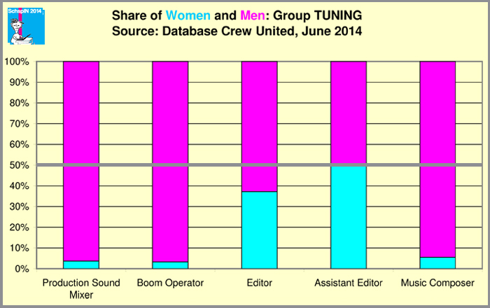 The group with the second highest male ratios. Only the editing is the odd one out, whereas sound and music are very male dominated departments (each around 95 %). Again: why? I have not heard from any survey that proved women to be worse at hearing or fine motor skills (the switches!). So what else could be behind this? A question of education? Some dislike for technical work? A female editor told me that the share of women in that line of work had increased considerably since film (and editing) turned digital. When working in a studio doing dubbing or voice-overs I have regularly worked with women. What is so different in the sound recording divisions of filmmaking that women are uninterested or can’t get in?