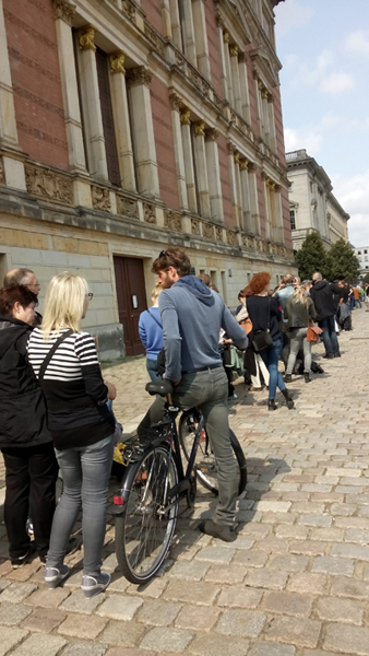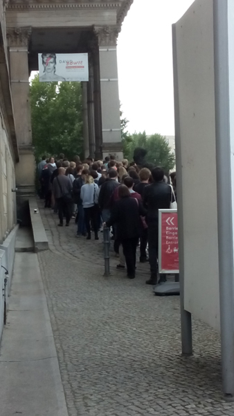 - j) Die Schlange ist zum Glück langsam, und die netten Leute vor mir haben meinen Platz freigehalten. Fein. Nur noch eine Wand trennt mich von der Ausstellung!