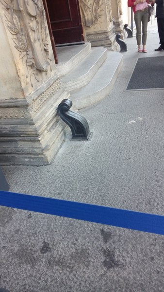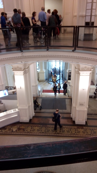 - f) Die Ausstellung ist im 1. Stock. Da ist bestimmt auch die Garderobe (und die Toiletten), ich hab jedenfalls unten keine Hinweisschilder gesehen. Oben heißt es auch wieder Anstehen. Da ist der Eingang zur Ausstellung, direkt über dem Eingang zum Gebäude. Ich hab schon einen weiten Weg geschafft!