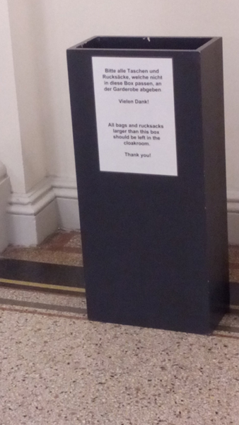 - i) Der Taschenmesser. Meine ist zu groß. Die Garderobe ist doch nicht oben, sondern unten im Keller. Da gab es auch Hinweisschilder, aber die fielen nicht groß auf (mir jedenfalls nicht). Das heißt ich muss jetzt noch mal runter, renn renn renn, immer 2 Stufen auf einmal, Tasche abgeben, und genauso wieder hoch, ich bin gut in Form!