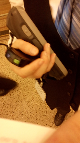 - c) Tadaa! Oben auf der Treppe angekommen. Es dürfen immer genauso viele rein wie rausgekommen sind. Und das heißt: die Frau vor mir ist drin, ich warte noch eine Runde am blauen Band. Hier kriegen wir Bons, die wir an der Kasse vorzeigen sollen.