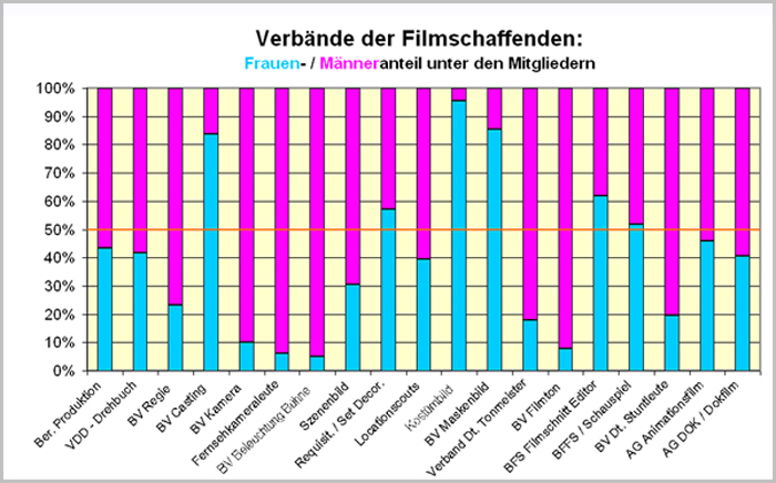 Prozentual gendermäßig relativ ausgeglichene Mitgliederzahlen (zwischen ungefähr 40 : 60 bis 60 : 40) weisen die Verbände Produktion, Drehbuch, Requiste / Set Decorator, Locationscouts, Filmschnitt, Schauspiel, Animation und Dokfilm auf.