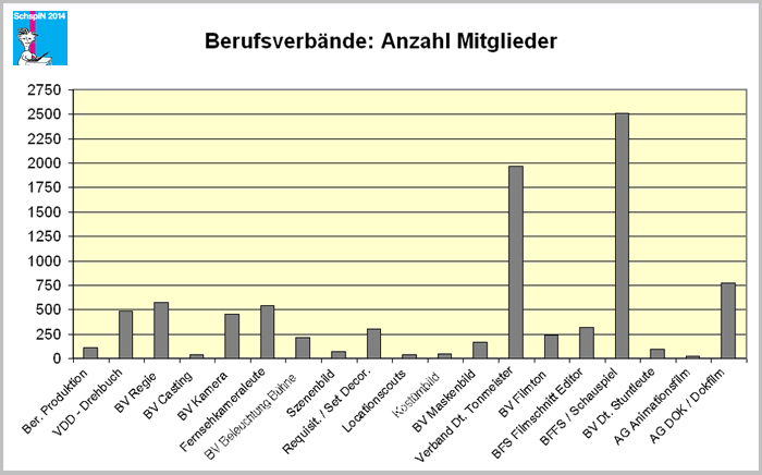Verbände mit weniger als 100 Mitgliedern sind Casting (37 Mitglieder), Locationscouts (43), Stunt (97) und Animationsfilm (24). Die beiden Zweige vom VSK haben 75 (Szenenbild) bzw. 45 (Kostümbild) Mitglieder.