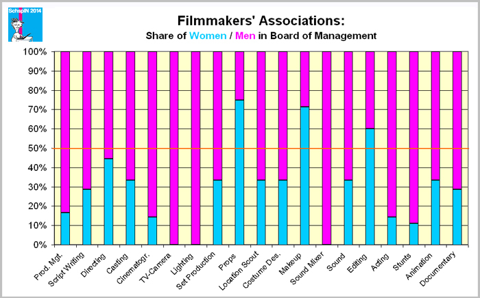 Curernctly ten out of 18 filmmakers’ associations have a share of women of more than 30 % on their boards, three even more than 50 %. Eight boards have less than 30 % women, six even less than 15 %. An from the men’s point of view: only two associations have less than 30 % men on their boards (Set Decorators 25 %, Make-Up 28,4 %).