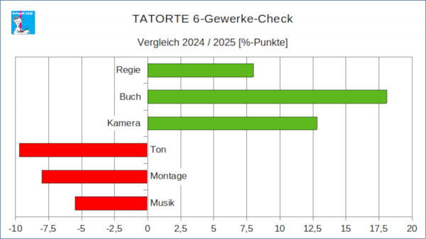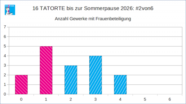 Dieser Artikel hat doch etwas länger als gedacht, und gerade habe ich gesehen, dass die TATORT-Sommerpause (in der allerdings TATORT-Wiederholungen ausgestrahlt werden) schon im Mai beginnt. Deshalb kann ich noch den 6-Gewerke-Check und #2von6 für die 16 Filme der ersten Hälfte 2026 anbieten.
