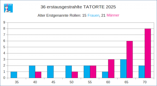 Und vor der Kamera? (auch hier beziehen sich alle Altersangaben auf den 1.1.25, und wer 2025 in zwei oder mehr TATORTEN ermittelt hat landet mehrfach in der Grafik)