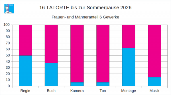 Im 2. Halbjahr 2025 waren bei keinem Tatort Filmfrauen an vier oder fünf Kerngewerken beteiligt. Den einzigen TATORT mit 5von6 gab es im 1. Halbjahr, BOROWSKI UND DAS HUNGRIGE HERZ, Kiel 12.1.25.