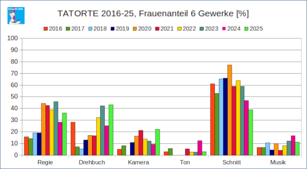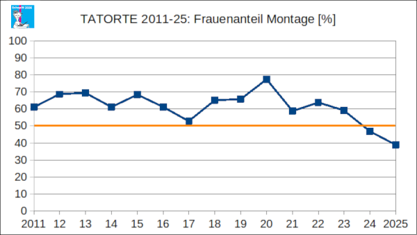 Montage war zu analogen Filmzeiten eine Frauentätigkeit, seit der Digitalisierung rücken Männer nach, Editorinnen kommen weniger zum Einsatz, vor allem im Kino. Bei Fernsehproduktionen sah das lange noch anders aus. Im 6-Gewerke-Check eines TATORT-Jahrgangs gab es hier immer die Frauen-Höchstwerte, bei manchen TAT-Orten, z.B. Wiesbaden, war es das einzige Kerngewerk, in dem überhaupt mal eine Frau beschäftigt wurde. Jedoch, 2024 fiel der Editorinnenanteil erstmals unter 50 %, 2025 für die 36 TATORTE sogar unter 40 %. Oh.
