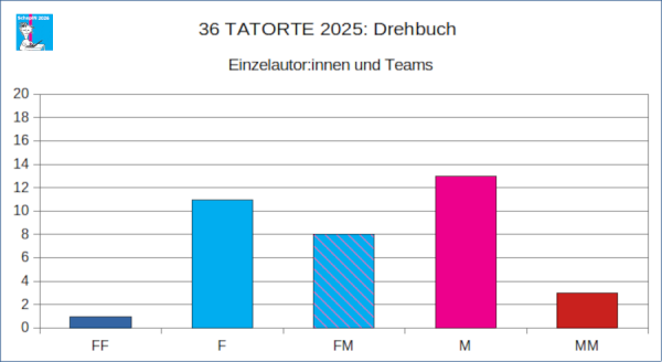 Ich hatte zur TATORT-Sommerpause 2025 vermutet (TATORTE Sommer 2025 – Erstes Zwischenziel erreicht), dass sich die hohen Frauenanteile in den sechs Kerngewerken nicht bis zum Jahresende halten würden; – und tatsächlich ist das so eingetreten, wie schon in den Jahren zuvor: