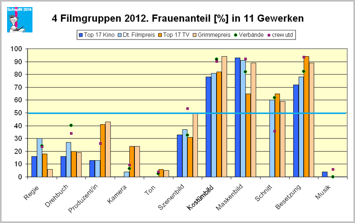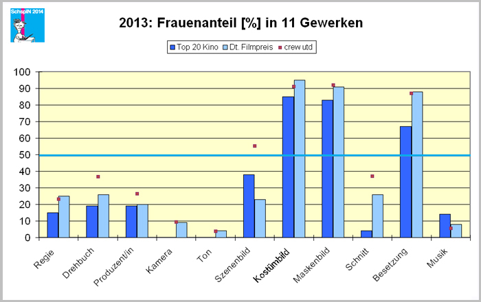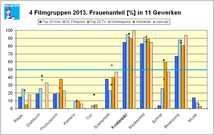 - Die Übersicht zeigt für die vier Filmgruppen 2013 deutliche Unterschiede für die allermeisten Gewerke. Die geringste Streuung im Maskenbild: Frauenanteile zwischen 83 und 91 %.