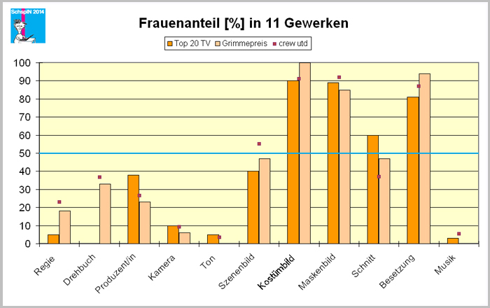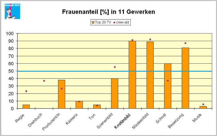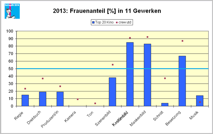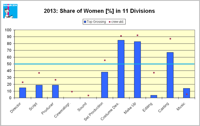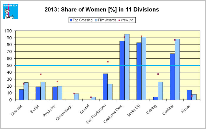 - Top 20 Kinokassenerfolge: keine Kamerafrau, keine Tonmeisterin, bei Drehbuch, Schnitt und Casting der Frauenanteil deutlich unter dem Branchenwert