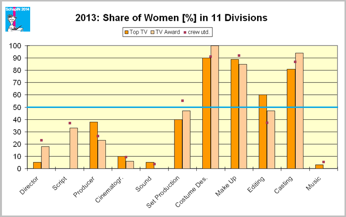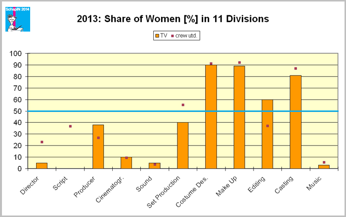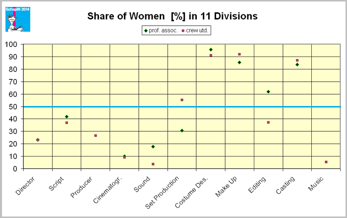 We can make out a more or less distinct separation of mainly female / mainly male tema positions in the German film and TV industry, although this can vary considerably in different groups of films for individual departments. Maybe a more thorough investigation or survey, e.g. undertaken by the professional film associations, could help finding possible reasons for these phenomena.