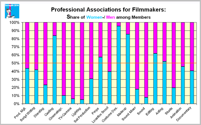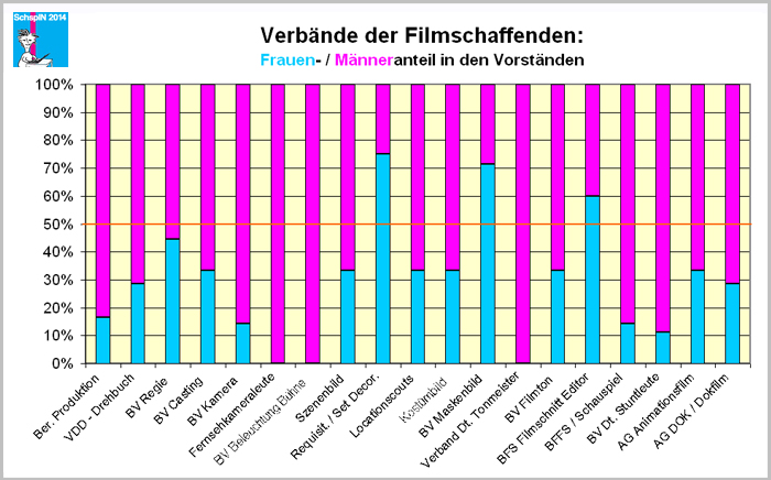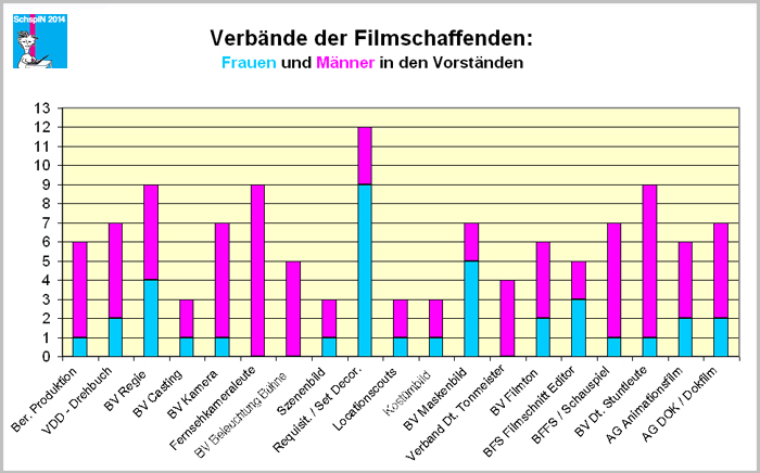 Prozentual gendermäßig relativ ausgeglichene Mitgliederzahlen (zwischen ungefähr 40 : 60 bis 60 : 40) weisen die Verbände Produktion, Drehbuch, Requiste / Set Decorator, Locationscouts, Filmschnitt, Schauspiel, Animation und Dokfilm auf.