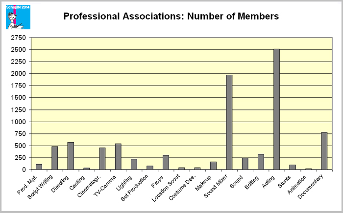Genderwise relatively balanced member statistics (roughly between 40 : 60 and 60 : 40) can be found for the associations for Production, Scripts, Set Decorators, Location Scouts, Editors, Actors / Actresses, Animated Films and Documentaries.